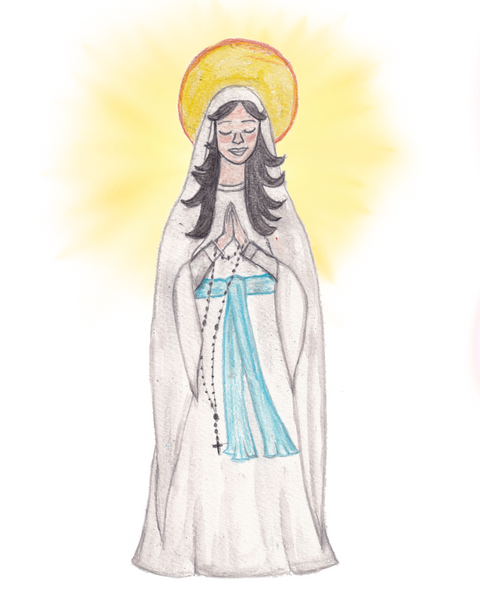 This Catholic art print showcases, Our Lady of Lourdes. It makes a perfect Catholic gift for Christmas, baptism, first communion, confirmation, and birthdays.